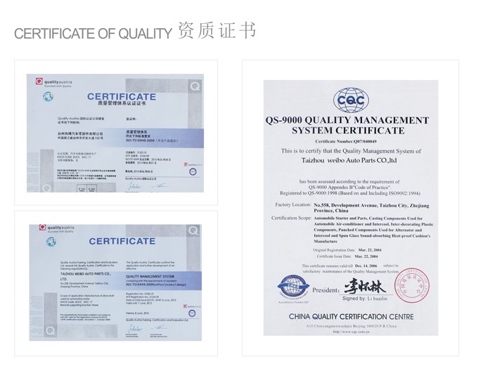 关于台州伟博汽车零部件有限公司简介:台州杰盛达汽车零部件有限公司成立于1989年,公司座落在台州市椒江区。台州杰盛达汽车零部件有限公司是一家生产起动机轴类件 的专业厂家,年生产能力:驱动轴300万件,电枢轴100万根,产品系列覆盖博世、雷米、三菱、电装、日立、福特等系列。 公司已有多年与主机配套经验,包括湖北神电,上海日立,长沙汽车电器厂,苏州依斯克拉。 公司已通过并按照TS16949的要求建立并完善质量管理体系,关注过程控制及过程改进,以保证我们的产品和服务更好的满足客 户要求。 公司拥有专业的设计开发、销售、生产管理人员及受过良好培训的员工,能迅速准确的识别并满足客户的需求。公司拥有齐全一 流的生产、检测设备,能对产品原材料采购、生产制造、产品的检验、实验整个过程实施有效监控。